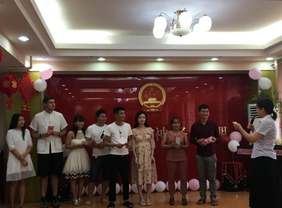 8月7日(农历七月初七),是我国传统的七夕节。“七夕今宵看碧霄,牵牛织女渡鹊桥。家家乞巧望秋月,穿尽红丝几万条。”在这个具有中华文化特色的“七夕”日子里,不少中外新人携手相拥来到厅婚姻登记处,缔结异国异域之姻。为祝福新人、倡导新风,厅婚姻登记处开展了“传承中华美德,倡导文明婚俗”主题活动。