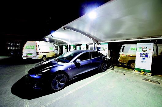 图为:8月28日晚,一辆特斯拉电动车在武汉徐东大街的一家充电站充电。该车充满约60度电,电费不足70元,可行驶近500公里。