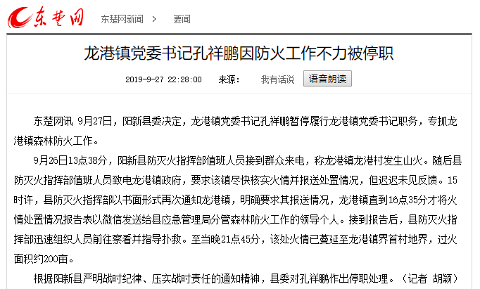 9月27日22时28分,东楚网发布一则通报:黄石市阳新县委决定,龙港镇党委书记孔祥鹏暂停履行龙港镇党委书记职务,专抓龙港镇森林防火工作。