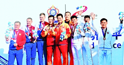 中国八一射击队在25米手枪军事速射团体比赛中,夺得本届军运会首枚金牌。俄罗斯代表队、朝鲜代表队分列二、三名