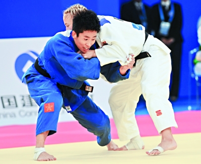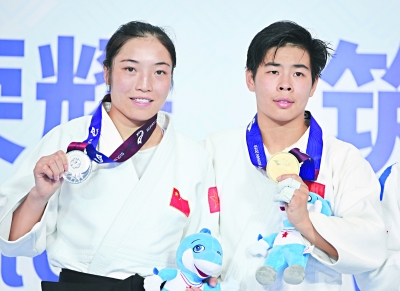女子52公斤级柔道比赛,黄丽茹(右)夺得冠军,兰玉取得银牌 长江日报记者高勇 摄