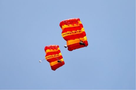18日,第七届世界军人运动会跳伞男子定点第一轮比赛在武汉汉南通用航空机场进行,中国队标志性的红黄相间伞和队服在空中绽放,十分亮眼。