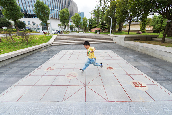 重庆市南川区一个孩童在廉洁文化公园象棋地雕上玩耍。象棋地雕棋盘上刻着“孝悌忠信礼义廉耻”八个大字,边缘刻有警言警句“时刻清醒筑防线,走好人生每步棋”。(重庆市南川区纪委监委 夏于洪 摄)