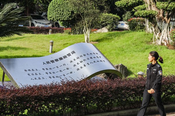 四川省泸县公安局一名民警从廉洁文化广场走过。近年来,泸县公安局坚持“文化育廉,文化育警”,大力培育廉洁文化氛围,强化廉洁思想教育,不断筑牢公安干警廉洁自律思想防线。(四川省泸县纪委监委 吴威 摄)