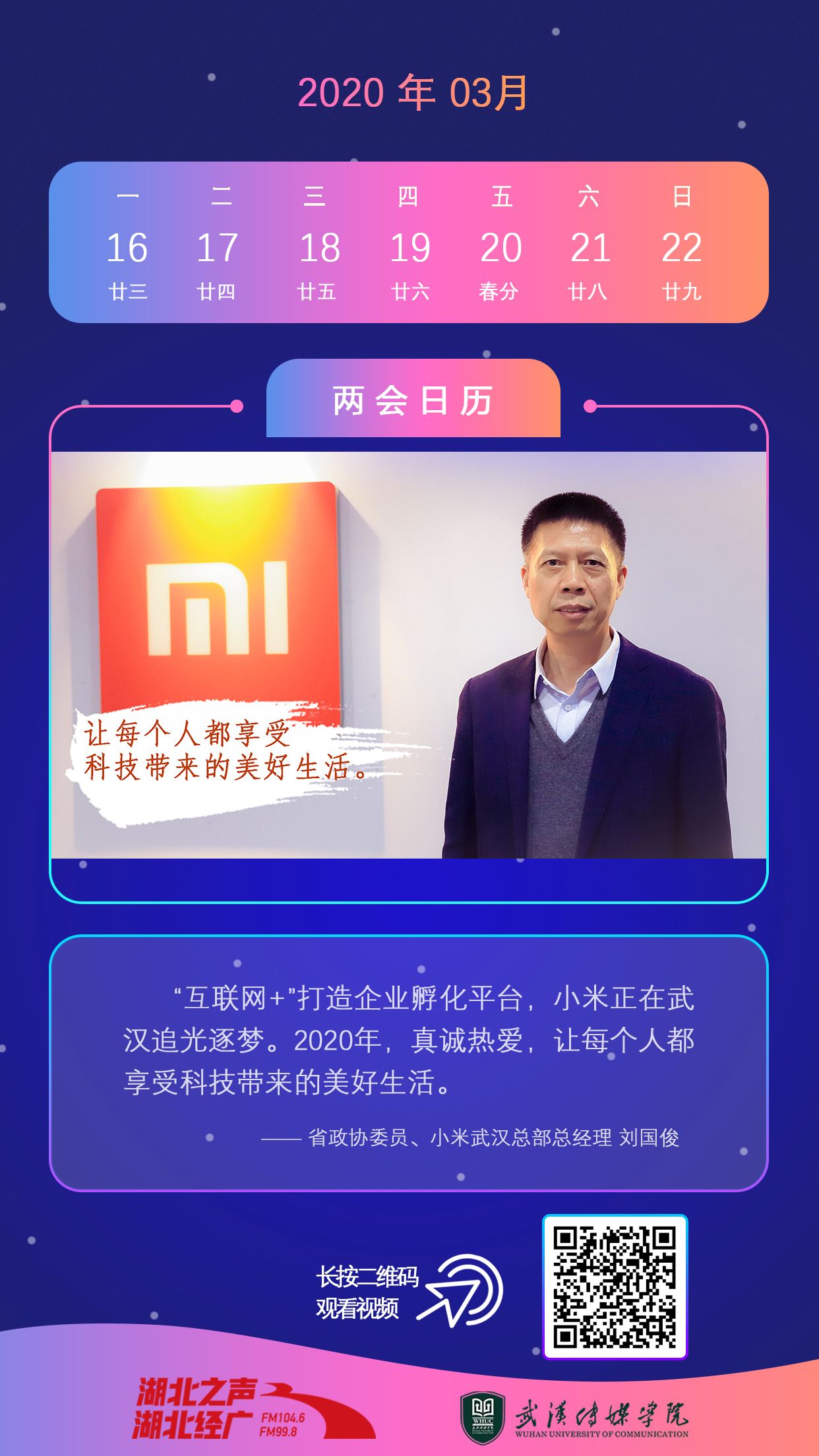 省政协委员、小米武汉总部总经理 刘国俊: “互联网+”打造企业孵化平台,小米正在武汉追光逐梦。2020年,真诚热爱,让每个人都享受科技带来的美好生活。 (实习编辑:程傲 责任编辑:胡汉敏) 责任编辑 胡汉敏