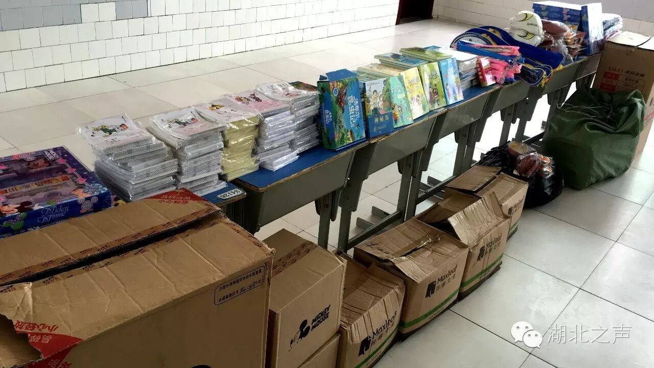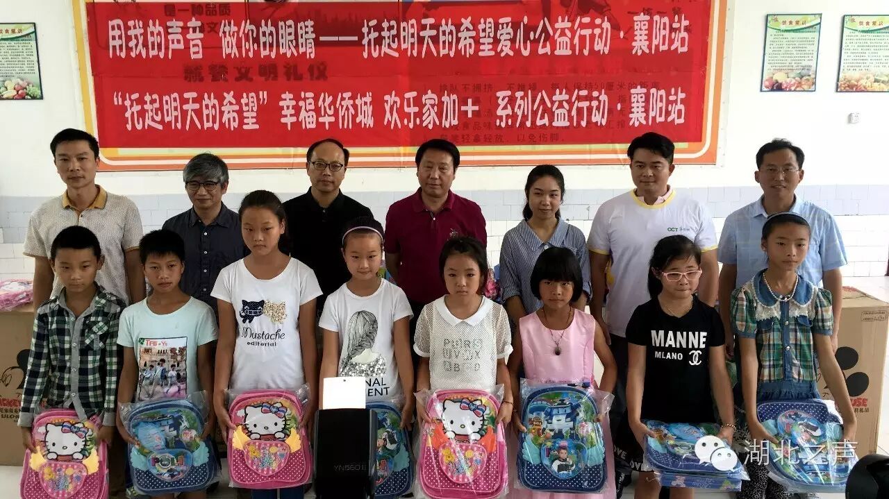 爱心捐赠仪式现场,来自湖北广播电视台、华侨城、襄阳团市委、市教育局的负责人为孩子们送上了书包、文具等物品。