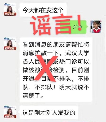 今日,一则谣言在网络传播——“武汉大学省人民医院发热门诊可做核酸试验检测不排队”,还有各种版本。对此,武汉大学人民医院迅速辟谣:网传“武汉大学省人民医院发热门诊可做核酸试验检测不排队”消息不实,请大家不要冒然前往,增加感染风险。
