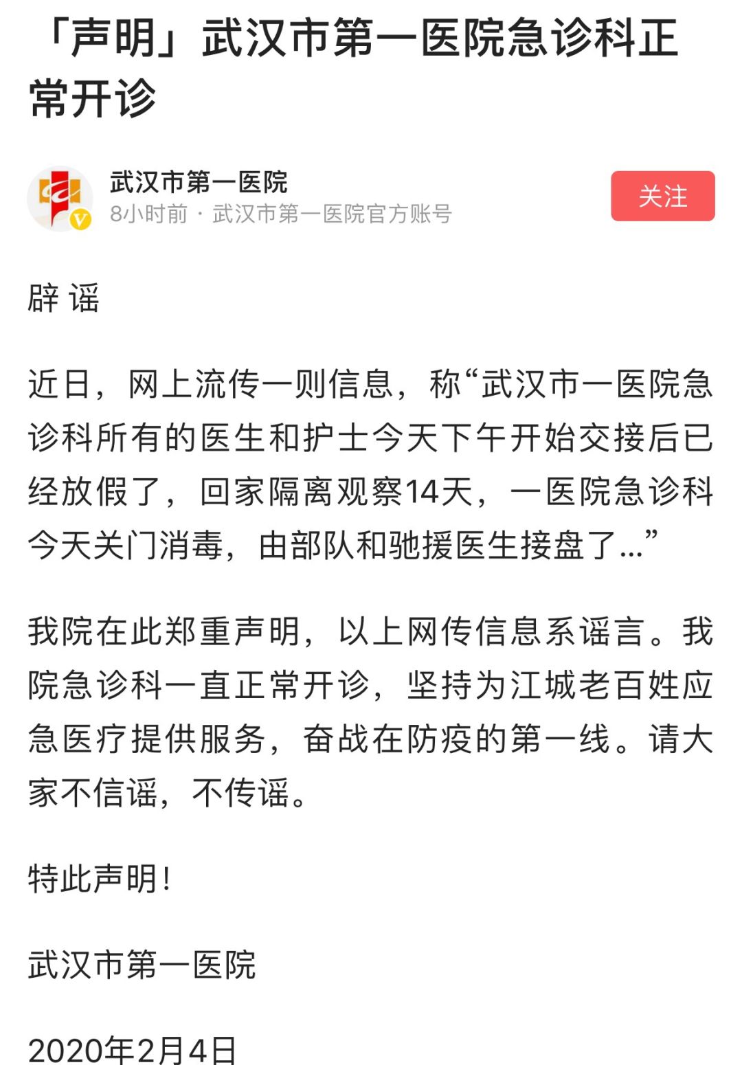 对此,武汉市第一医院郑重声明,该信息系谣言。该院急诊科一直正常开诊,坚持为武汉老百姓应急医疗提供服务,奋战在防疫的第一线。