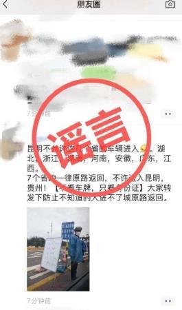 谣言七:湖北、浙江等七省车辆不允许进昆明