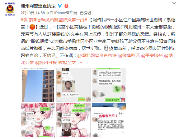 其实,“27楼扔下几万元人民币”的消息并非首先出现在武汉。2月10日14时58分,随州市公安局网络安全保卫支队官方微博“随州网警巡查执法”辟谣:“近日,一段某小区高楼往下撒钱的视频配以‘湖北随州一家人全部感染,元宵节有人从27楼撒钱’的文字在网上流传。经核实,所谓的‘撒钱视频’实为我市季梁佳园小区业主家三岁熊孩子趁父母不注意在阳台把钱当纸片抛撒,并非因感染病毒,厌世所致。疫情当前,呼请各位网友理性对待网络言论,不信谣、不传谣!”