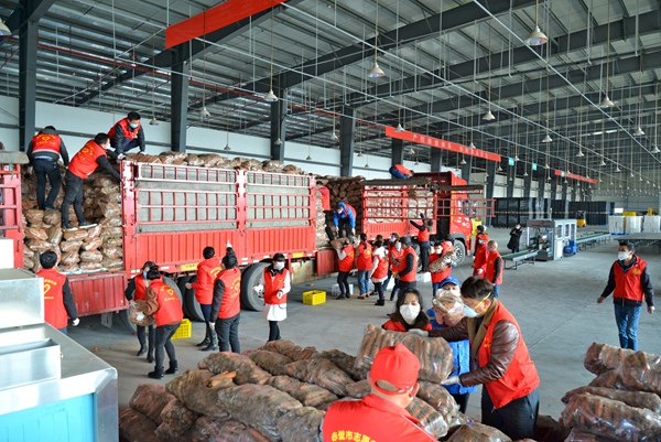 河北硅谷肥业有限公司紧急筹措10卡车共300吨新鲜蔬菜,连夜装车送往1000多公里外的湖北省赤壁市,支援身处疫区的赤壁人民。赤壁市50多名志愿者得到消息后结队前来,主动帮忙卸载蔬菜,并迅速送往各个防疫一线。(湖北省赤壁市纪委监委供 王莹 摄)