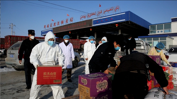 新疆维吾尔自治区阿克苏地区拜城县众多爱心企业为克孜尔检查站一线的医务人员和民警辅警送去方便面、纯净水、暖手宝等物品,以自己的方式向防控一线工作者表示慰问,为疫情防控贡献一份力量。(新疆维吾尔自治区阿克苏地区拜城县纪委监委供 李高 摄)
