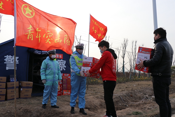 江苏省响水县组建“青年突击队”,冲锋在一线,为坚决打赢防控疫情阻击战贡献青春力量,该县团县委充分做好后勤保障,为队员们送去生活物资。(江苏省响水县纪委监委供 孙万文 摄)