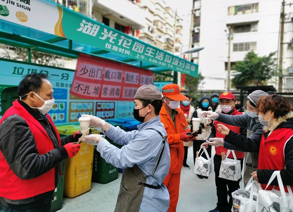 福建省福州市的一家奶茶店为附近的环卫工人、交通执勤人员们送上热气腾腾的奶茶,让这些默默坚守着岗位,在这个寒冷的冬日里的一线工作者感受到满满的温暖。(福建省福州市纪委供 叶义斌 摄)