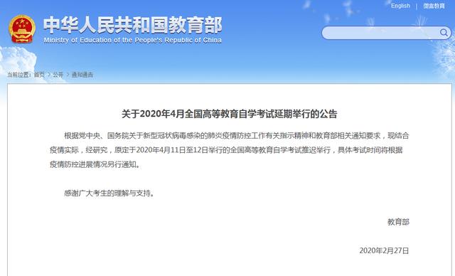 教育部网站2月27日发布,关于2020年4月全国高等教育自学考试延期举行的公告。