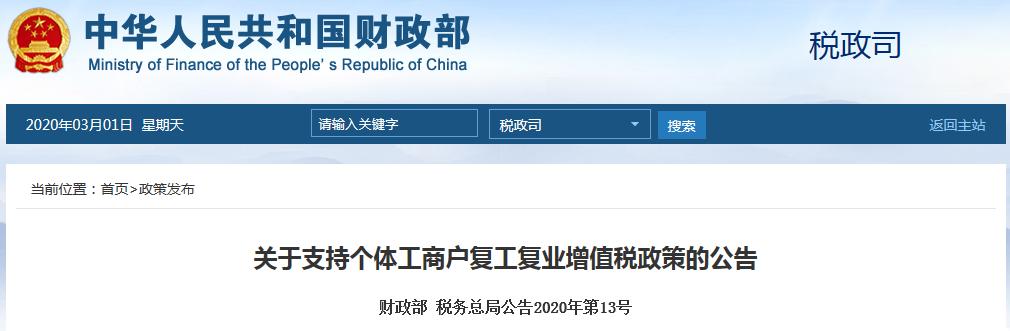 关于支持个体工商户复工复业增值税政策的公告