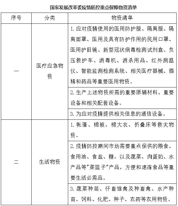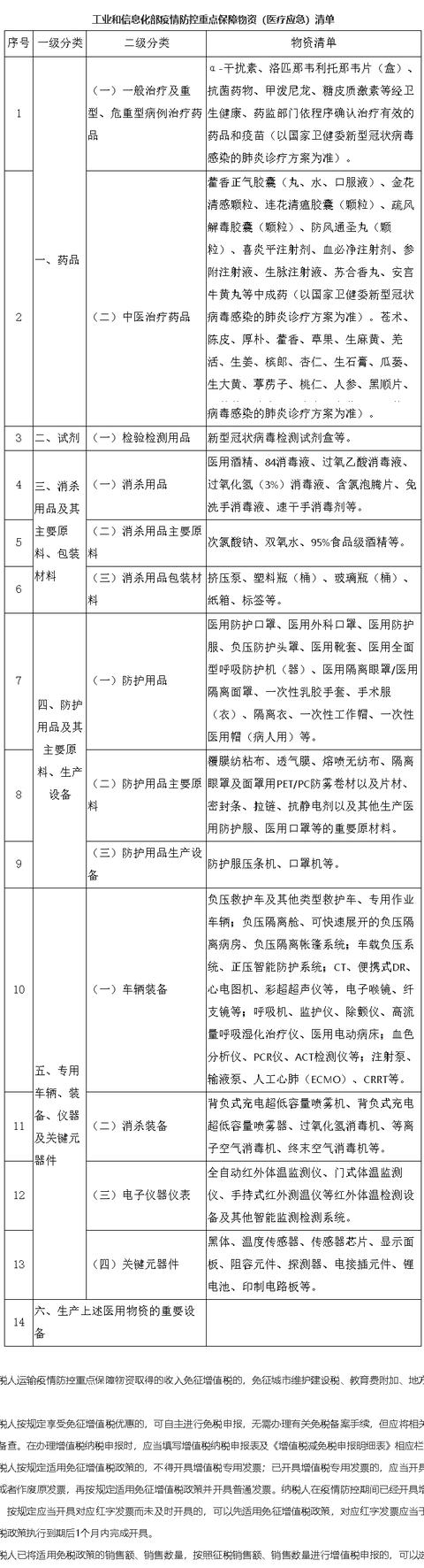 自2020年1月1日起,对纳税人运输疫情防控重点保障物资取得的收入,免征增值税。优惠政策适用的截止日期将视疫情情况另行公告。疫情防控重点保障物资的具体范围,由国家发展改革委、工业和信息化部确定,具体内容如下: