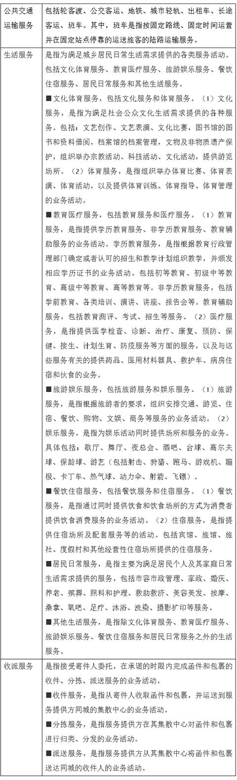 生活服务、快递收派服务的具体范围,按照《销售服务、无形资产、不动产注释》(财税〔2016〕36号印发)执行。