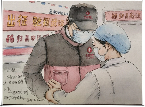 望艳艳的作品中,既有对身边平凡英雄的群像绘制,又有对媒体报道中感人事迹的拓影留痕。其中《出征》《护士变“厨娘”》等作品的创作灵感来自于望艳艳在秭归县中医医院当医生的丈夫对她的讲述。