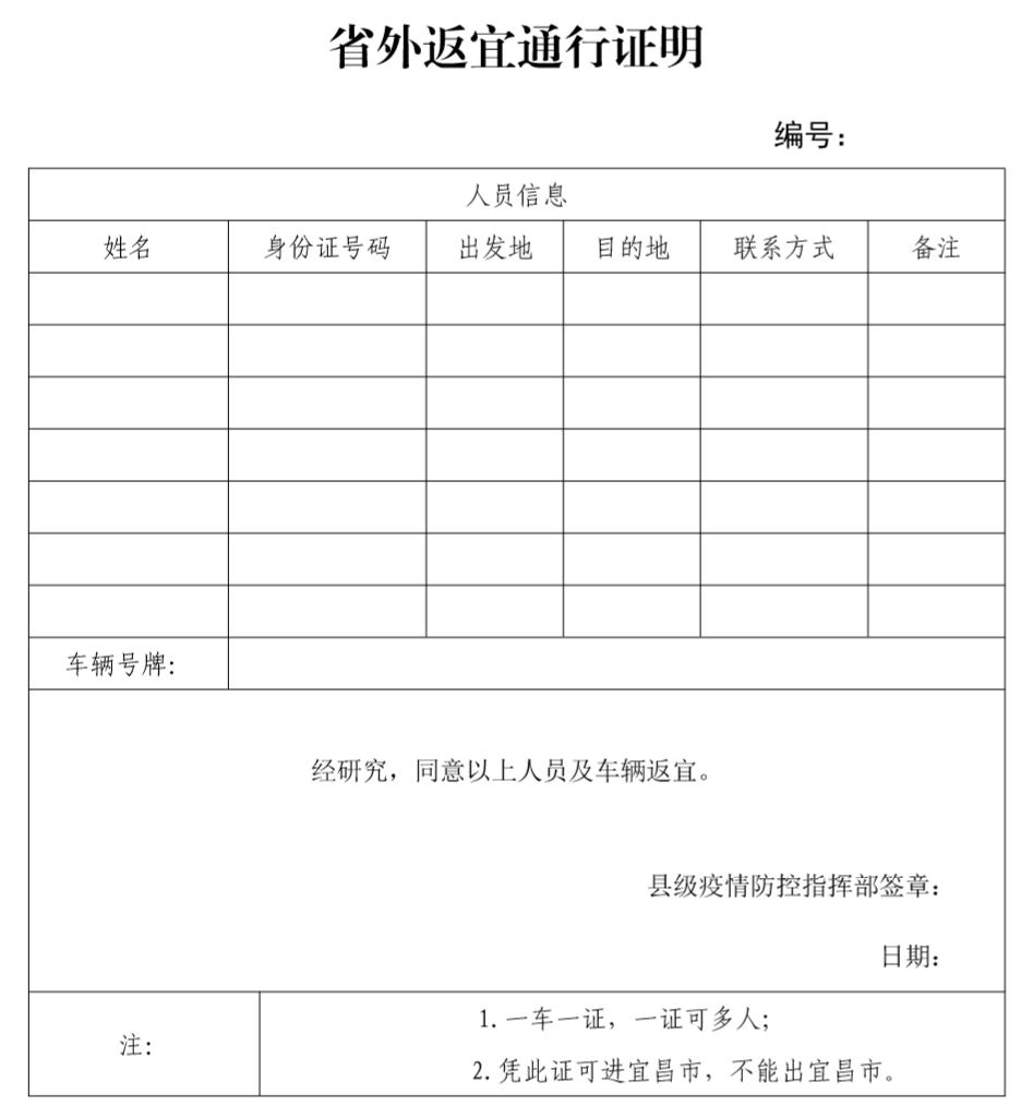 市内各交通管制点查验“湖北健康码”绿码(或外省“健康码”绿码,或健康监测证明)、《省外返宜通行证明》,人证相符的登记放行。市内各高速公路、市界普通公路交通管制点对持有《省外返宜通行证明》的车辆实行进入宜昌市单向放行。