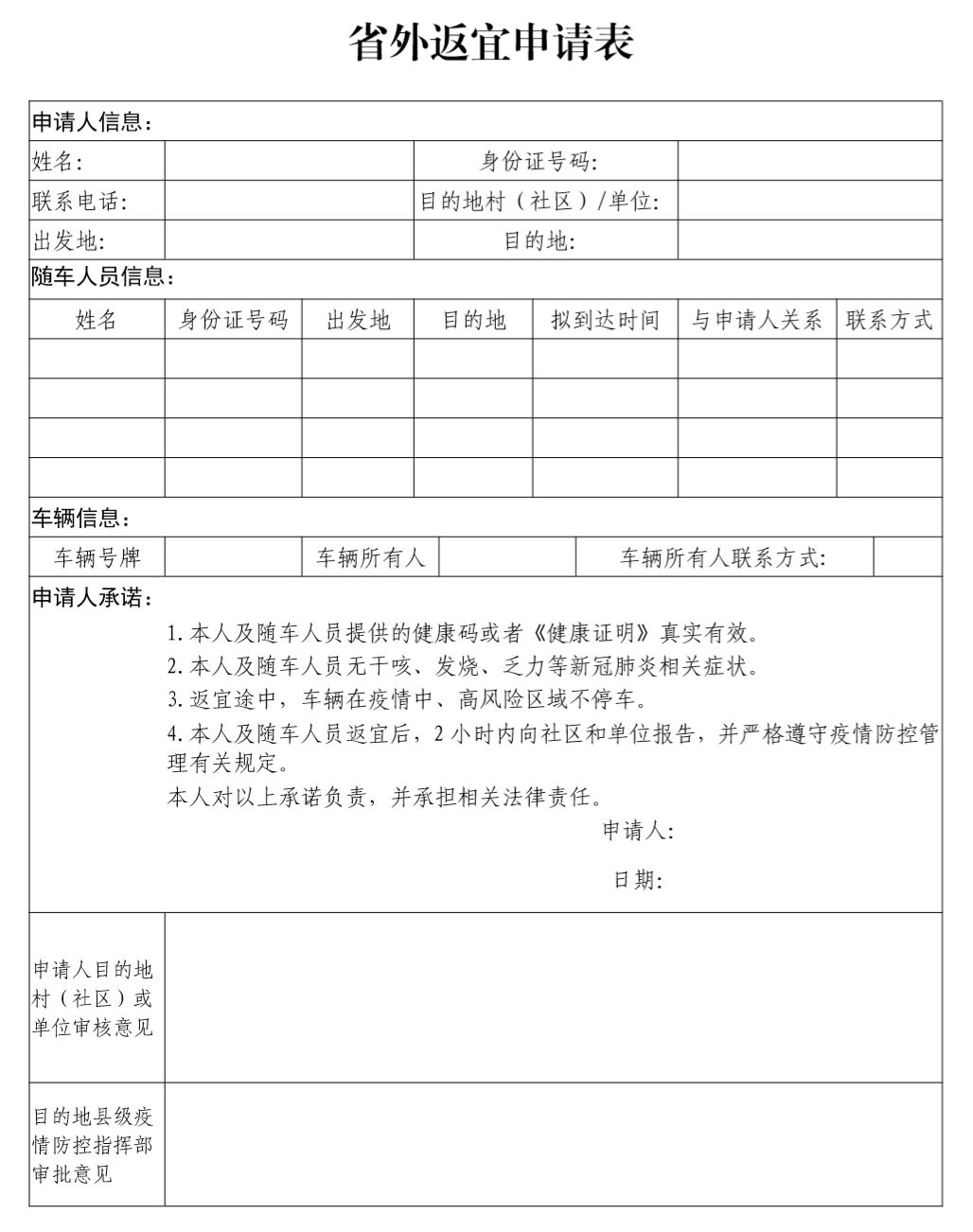 省外返宜人员自愿申请,填写《省外返宜申请表》,一车一表,一表可多人,所有人均须具备返宜健康条件。附件提供绿码或健康监测证明截屏照片,通过网络、传真等方式发送至目的地村(社区)或单位。