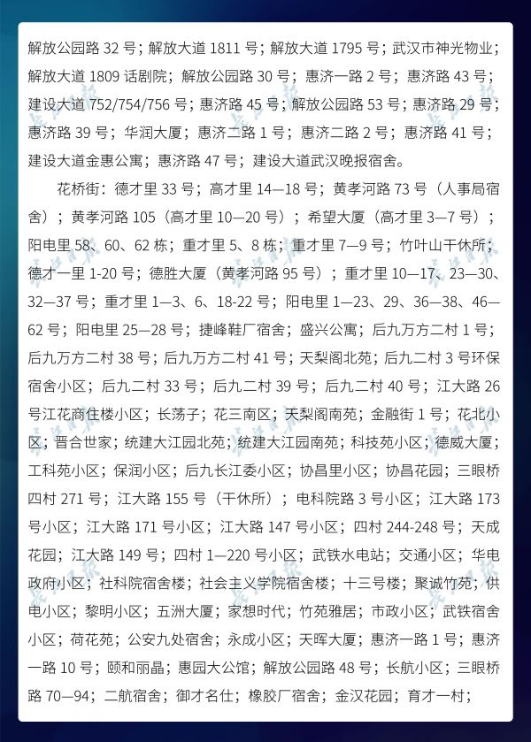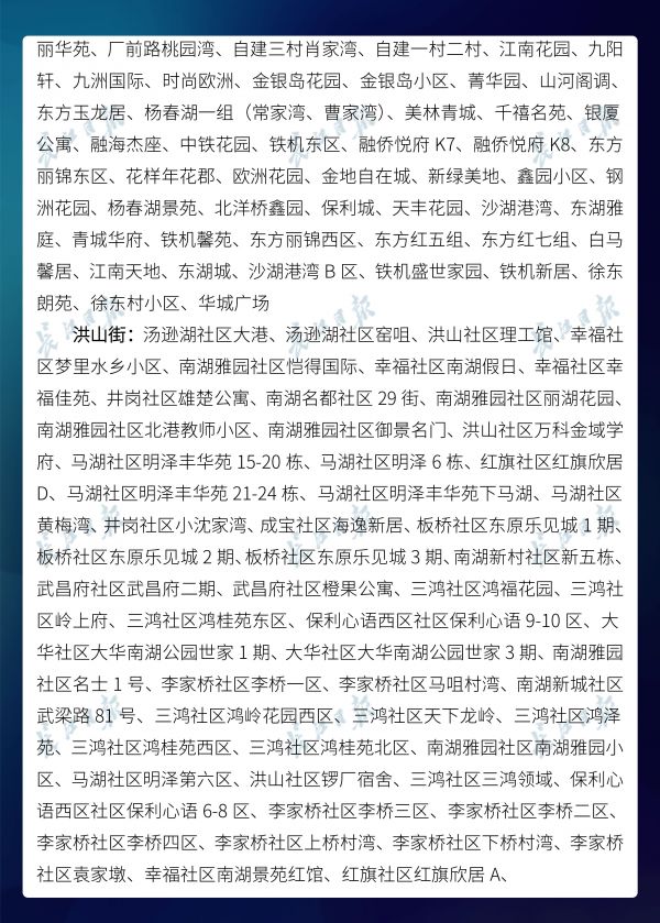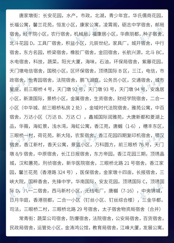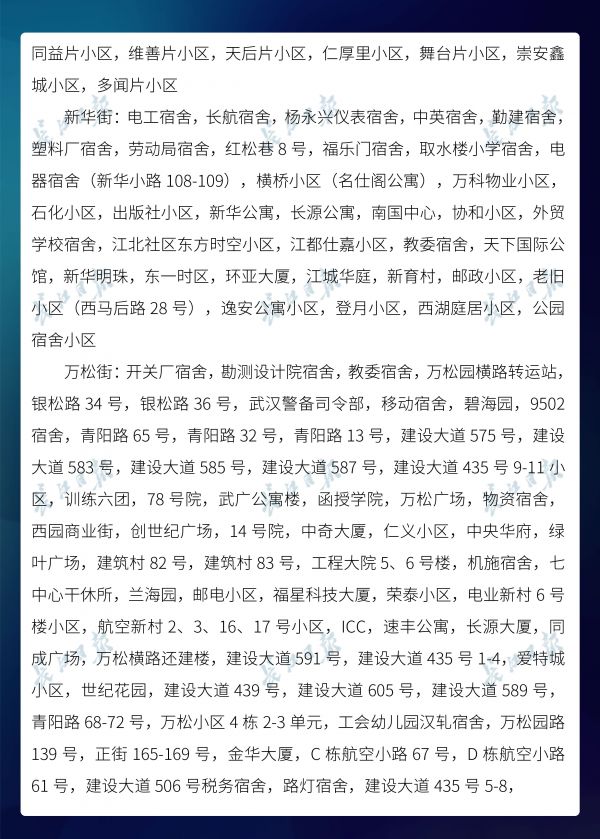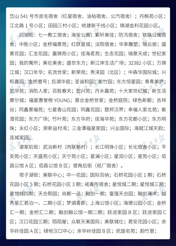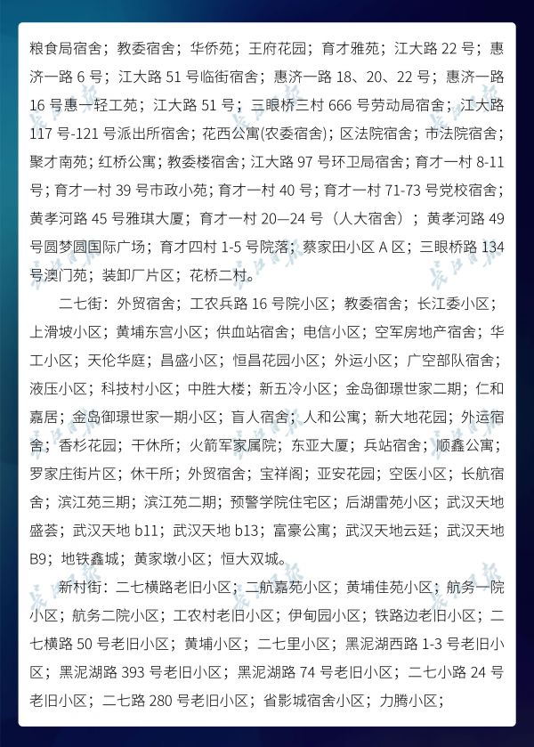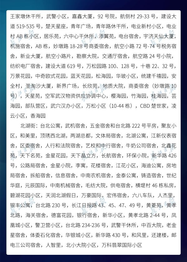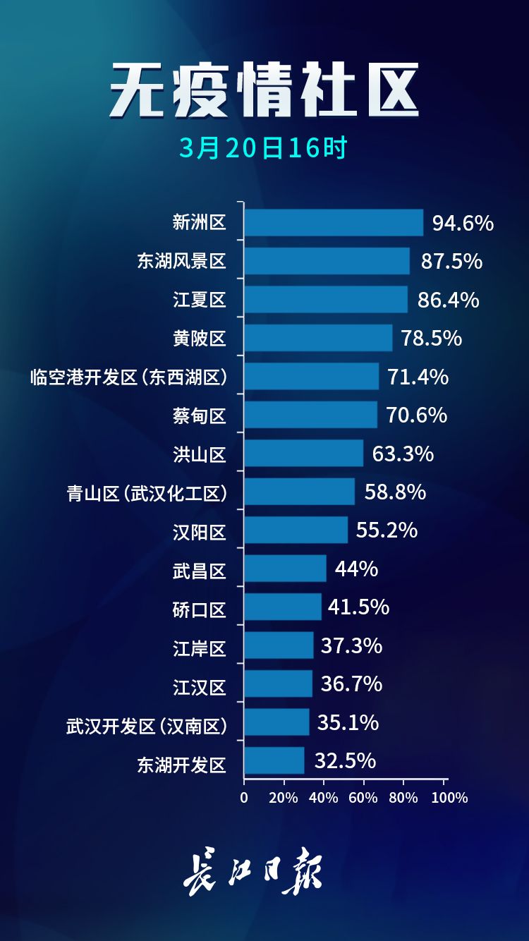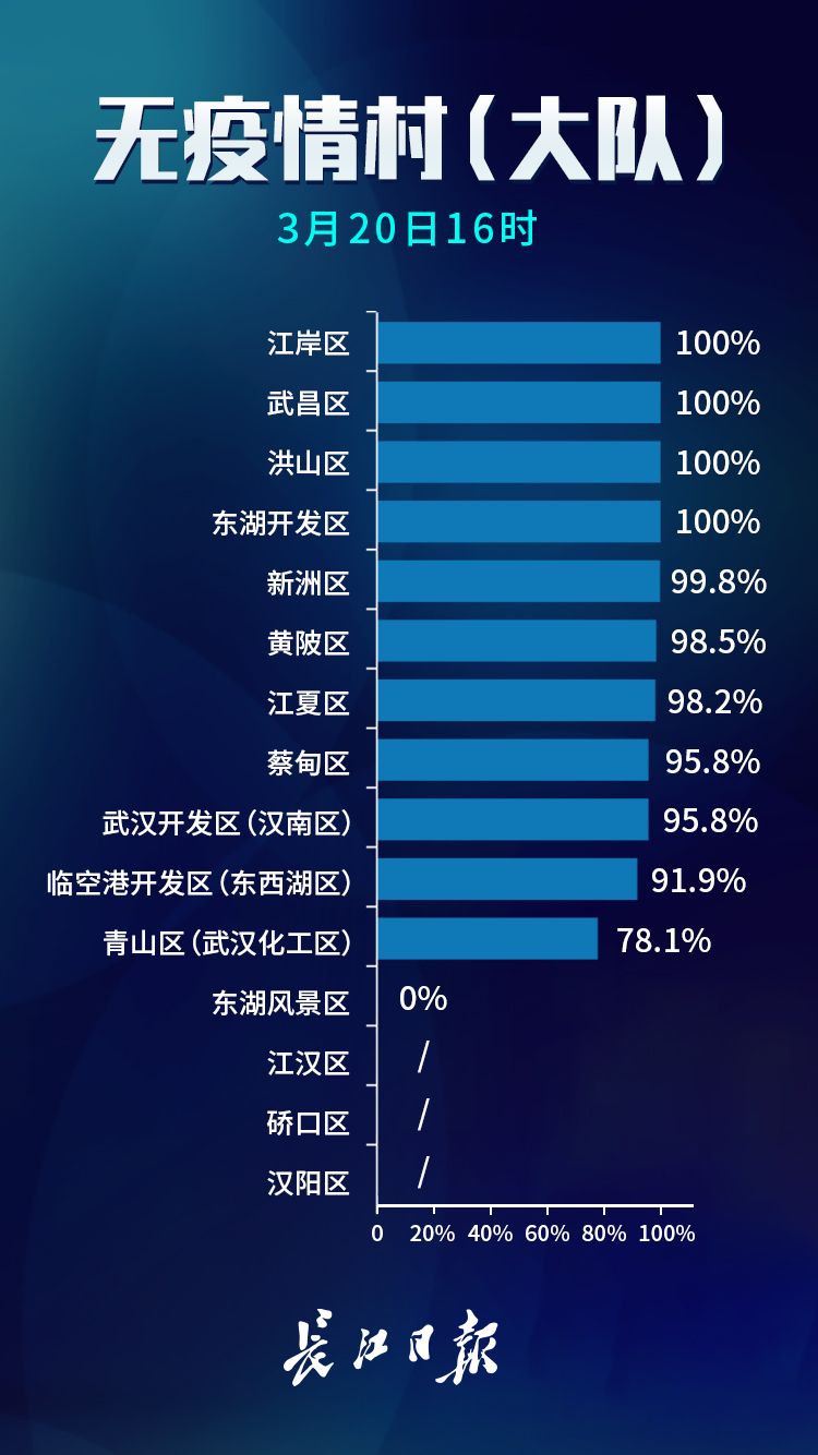 3月20日,武汉市新冠肺炎疫情防控指挥部社区疫情防控组公布全市第六次评定的无疫情小区、社区、村(大队)名单,命名第二批11个无疫情街道(乡镇)。截至3月20日16时,武汉已命名无疫情街道(乡镇)21个,洪山区天兴乡是中心城区首个无疫情街道(乡镇)。