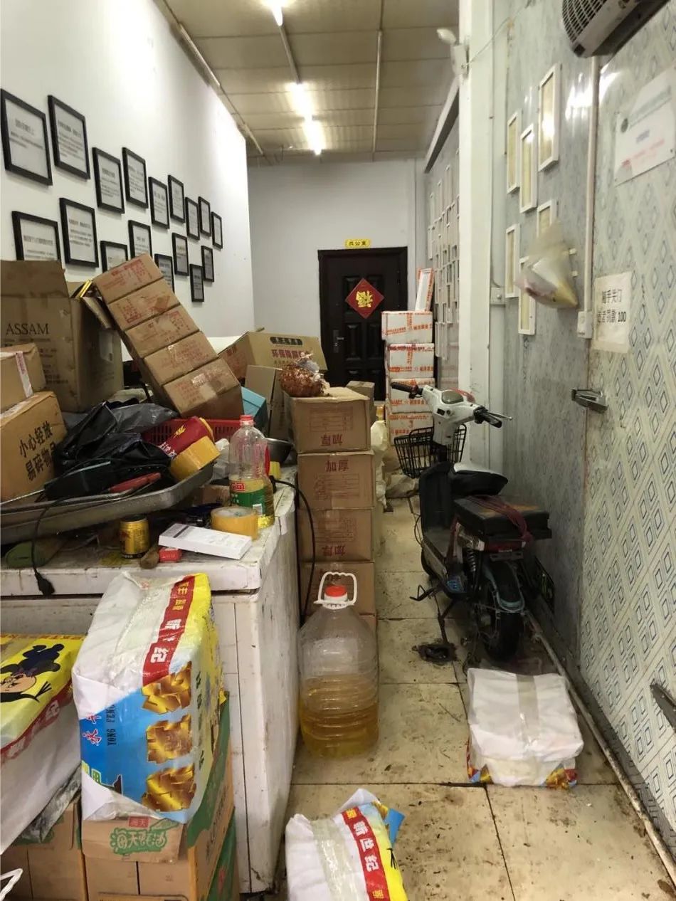 下午五点多,起风了,眼看天要下雨,大家加快了进度。米面油等没有变质的货品归类码放,再把地上的垃圾和蛆虫清理干净,反复进行消杀……大家的心情都有点难过,我们都知道,楚材社区就在户部巷隔壁,这里有很多经营小吃店的个体户,有类似经历和损失的,恐怕不止毛老板这一家。