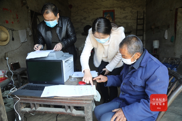湖北省十堰市竹山县纪委监委派出第六纪检监察组携带电脑、打印机等办公设施,深入该县潘口乡鱼岭村农户家中,核实耕地地力保护补贴发放情况,收集扶贫领域问题线索。(湖北省十堰市竹山县纪委监委 李建忠 摄)