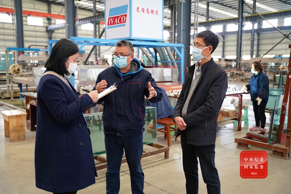 四川省金堂县纪委监委驻县经信局纪检监察组发挥监督作用,深入明达玻璃制造厂生产一线,了解企业恢复生产中遇到的困难和问题。(四川省金堂县纪委监委 胡进文 摄)