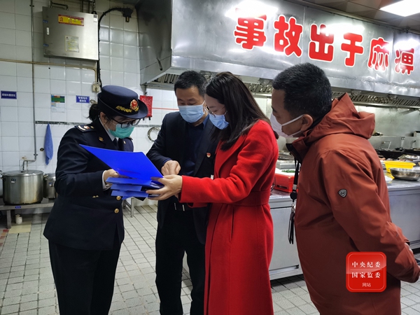 上海市金山区纪委监委第五派驻纪检监察组深入区市场监管局等相关职能部门到各复工营业饭店,实地开展监督检查,强调严格落实防控措施,决不能在任何环节发生疏漏。(上海市金山区纪委监委 朱媛 摄)