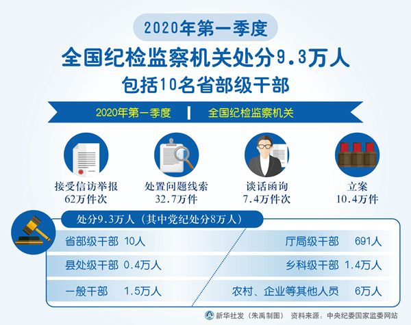 通报显示,2020年第一季度,全国纪检监察机关共接收信访举报62万件次,处置问题线索32.7万件,谈话函询7.4万件次,立案10.4万件,处分9.3万人(其中党纪处分8万人)。处分省部级干部10人,厅局级干部691人,县处级干部0.4万人,乡科级干部1.4万人,一般干部1.5万人,农村、企业等其他人员6万人。
