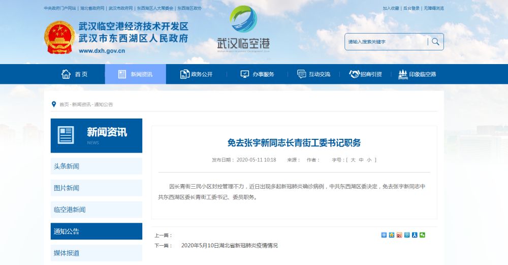 因武汉东西湖区长青街三民小区封控管理不力,近日出现多起新冠肺炎确诊病例,中共东西湖区委决定,免去张宇新同志中共东西湖区委长青街工委书记、委员职务。