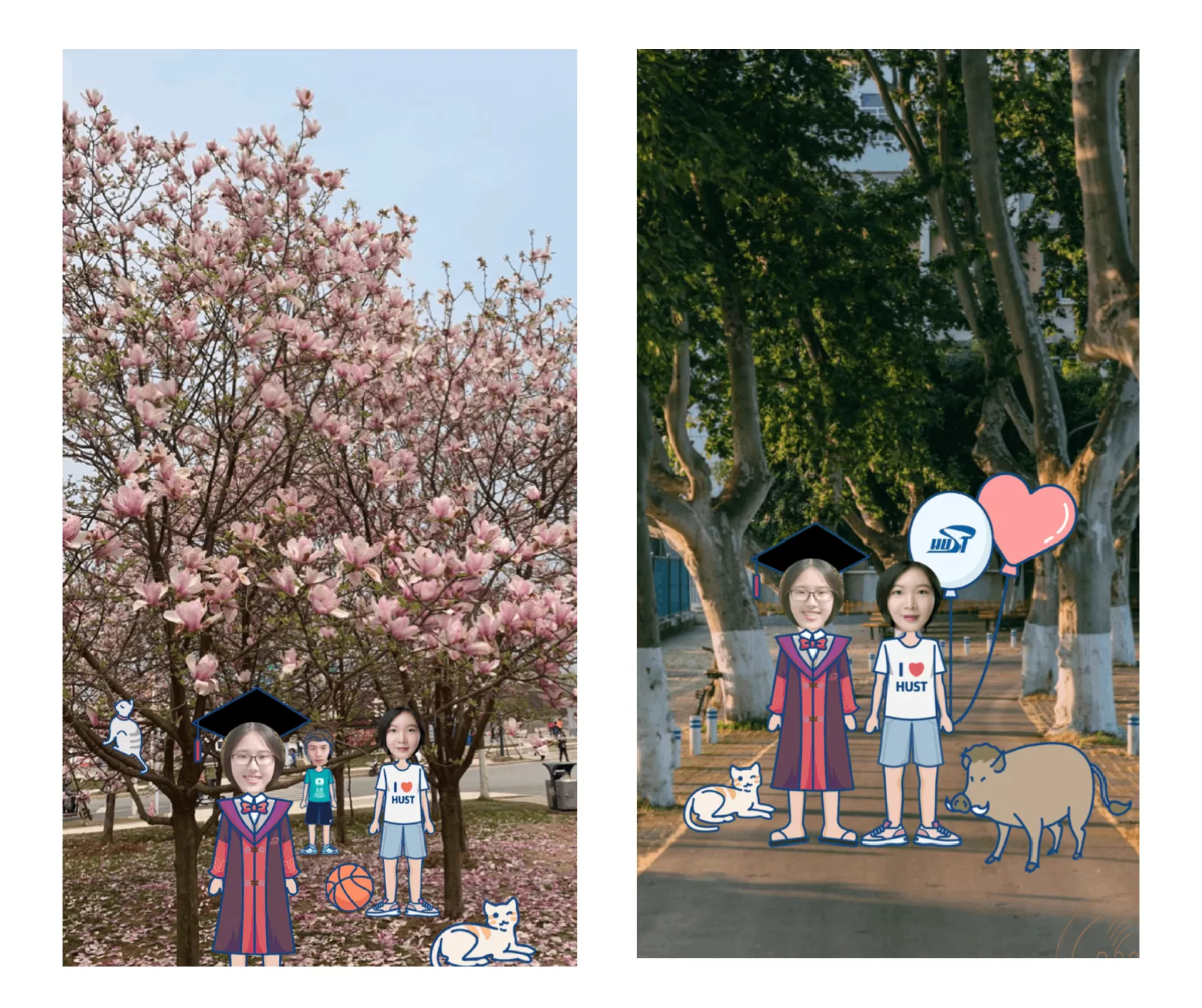 为了让毕业生们减少这个心中遗憾,华中科技大学党委宣传部旗下学生团队——冰岩作坊互联网团队的同学们开发出了一款主打线上合影功能的微信小程序“森林云相馆”,为不能相聚的师生们创造一个线上相聚的机会。在小程序中,师生们可自由diy自己的虚拟形象,在经过艺术加工的校园场景中,与好友们进行“云合照”。同时,用户们也能上传,自己的脸部照片与自定义背景,进行更自由的照片创作。