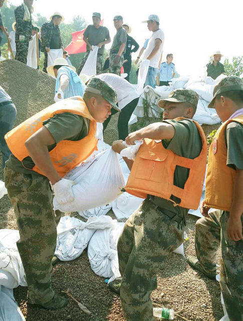 虽然顶着烈日、冒着高温连续作业,但官兵们战斗力很强、突击效果明显。截止上午12时,在当地群众配合下,已新打防浪桩800多根,加固子堤、铺设防浪布1000余米,填充沙袋2万余袋。