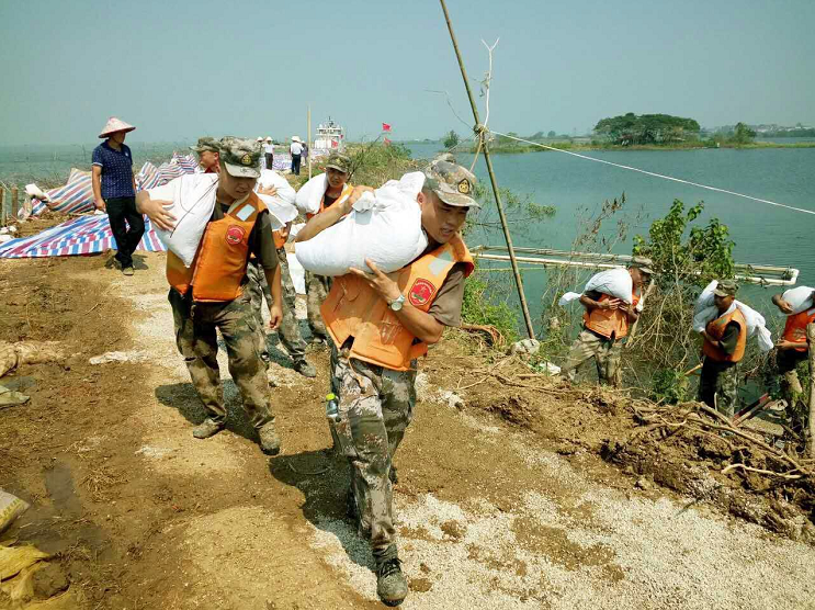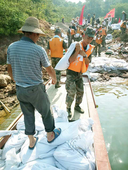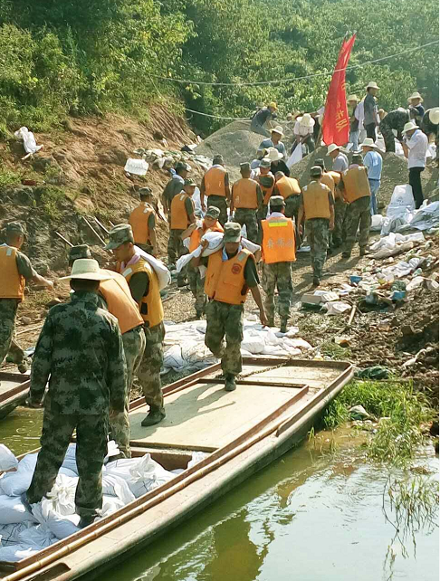 灾情就是命令!驻守在黄梅县蔡山镇的舟桥旅四营官兵于早上5时紧急赶赴事发地域。到达现场后,由于灾情紧急,舟桥旅官兵兵分三路,一路帮助村民填装、搬运沙袋上船,其余两路分别在塌方险段加固。当地镇政府机关干部、镇直部门工作人员和当地群众共计80余人,带着1台挖机、4台拖拉机和4艘渔船赶来增援。