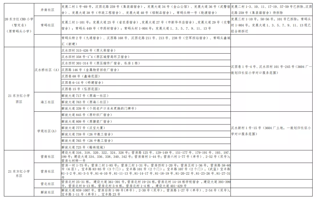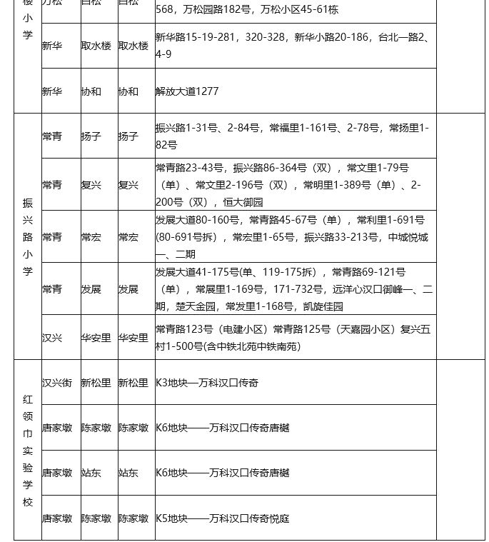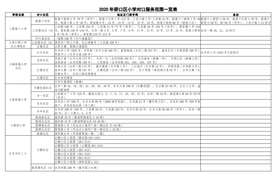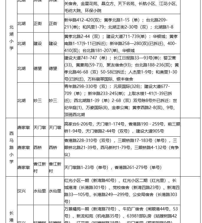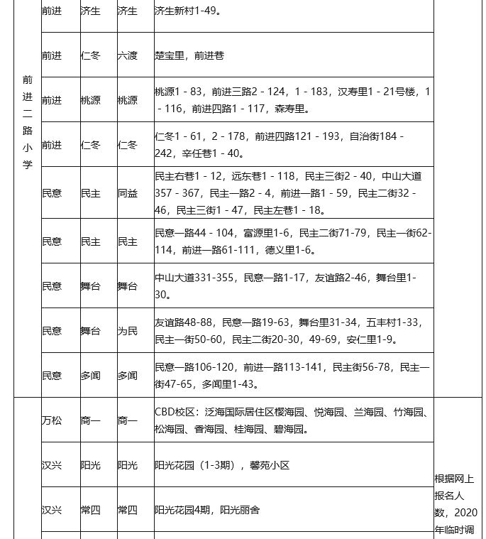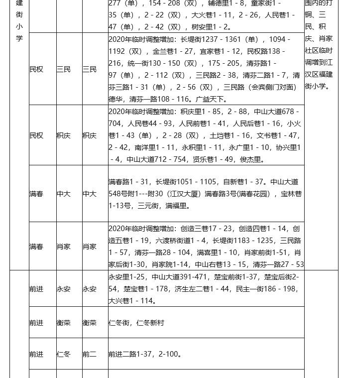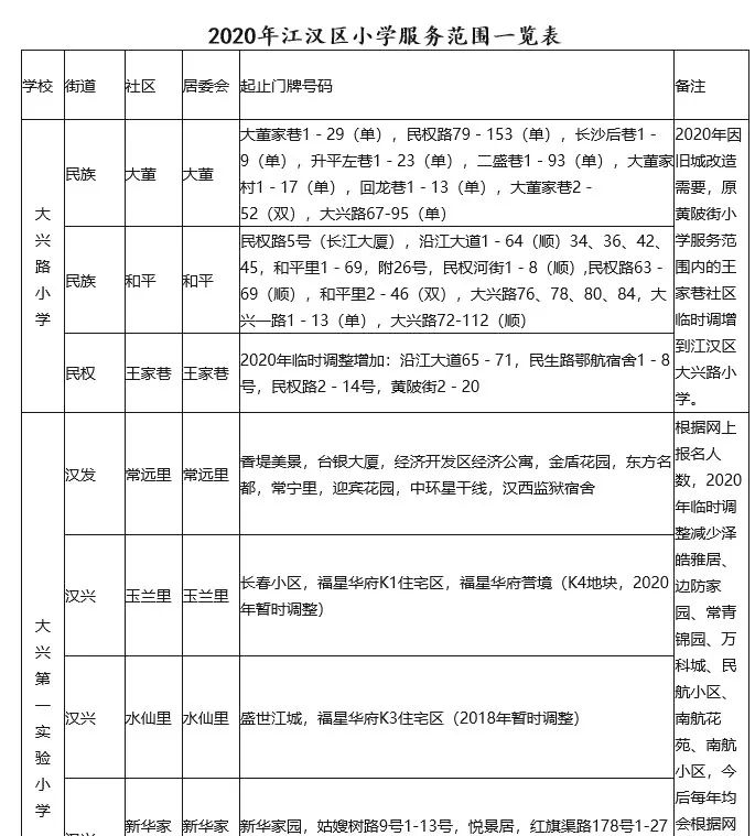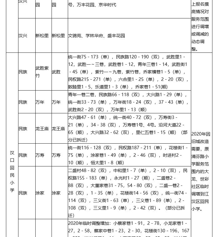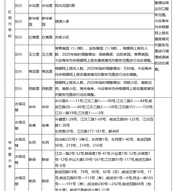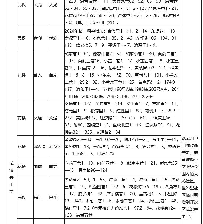 2020年,因旧城改造,黄陂街小学、清芬路小学暂停招收一年级学生,原对口服务范围内学生临时调整到周边小学入学。为缓解江汉区北部地区入学矛盾,从今年起,每年根据网上报名摸底情况,对服务范围进行调增或调减的动态调整。