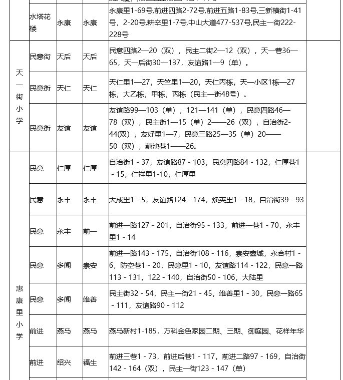 初中对口划片中,六中致诚中学,原本对口的台北路学校(小学部)变为育才第二小学立德校区。
