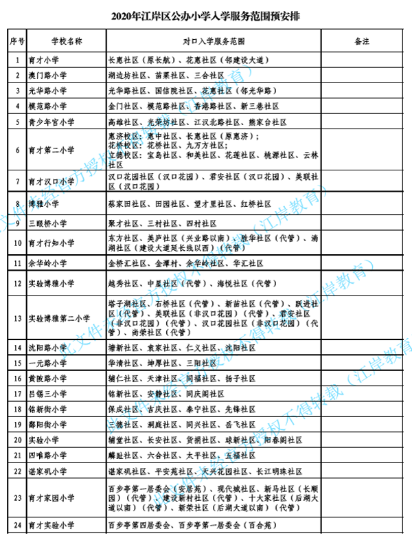 江岸区今年的对口划片基本跟去年保持一致,小学与初中对口划片略有变动。此次预安排列表中的“新面孔”,江岸区博雅小学为原江岸区蔡家田小学;武汉市实验博雅小学为原武汉市育才越秀小学;武汉市实验博雅第二小学为武汉市育才实验第二小学。此外,堤角小学的对口划片服务范围新增游湖社区(代管)。
