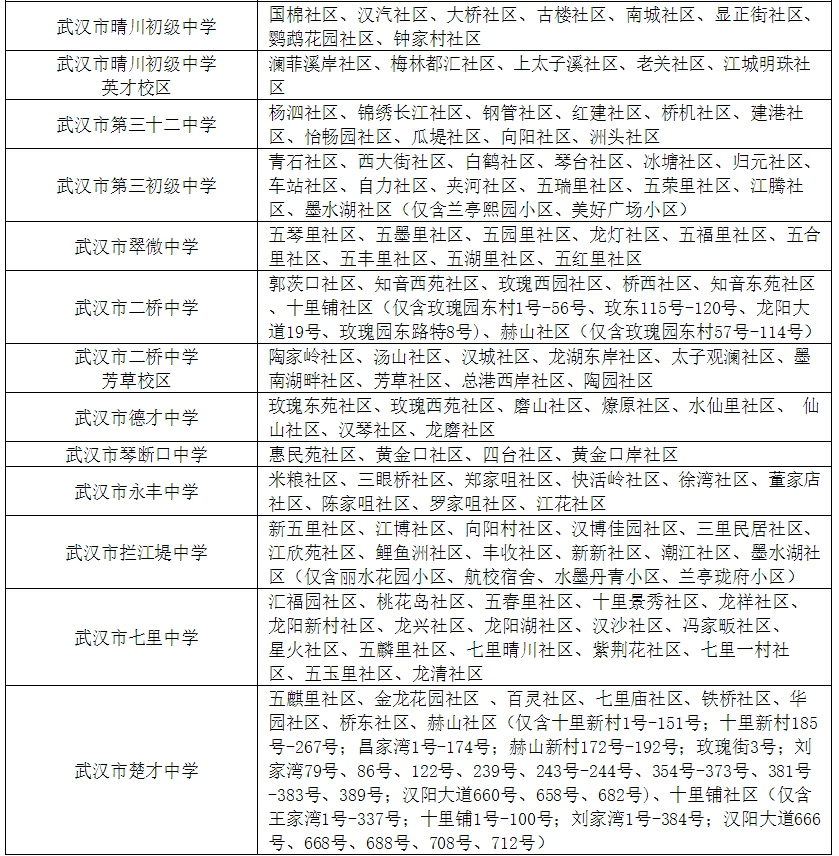今年武汉市十一初级中学除招收崇仁路小学的毕业生外,硚口区汉西小学、东方红小学(东区、南区、西区)、长征小学、崇仁寄宿学校的毕业生可自愿报名并通过电脑派位产生。武汉市第四中学初中部除招收韩家墩小学、山鹰小学、硚口区实验小学的毕业生外,水厂路小学、新合村小学、崇仁路小学新时代校区的应届毕业生可自愿报名并通过电脑派位产生。
