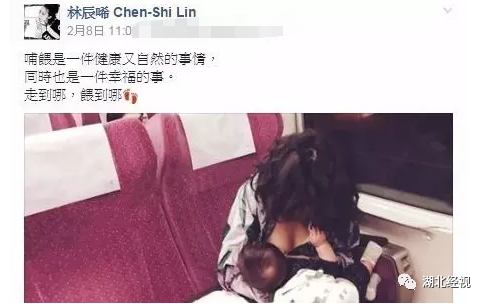 台湾女星林辰唏曾在社交平台上放了一张在火车上亲喂母乳的照片,同时写道:“哺乳是一件健康又自然的事情。走到哪,喂到哪。”似乎有意倡导妈妈公众场合哺乳行为,大众也应该要接纳。