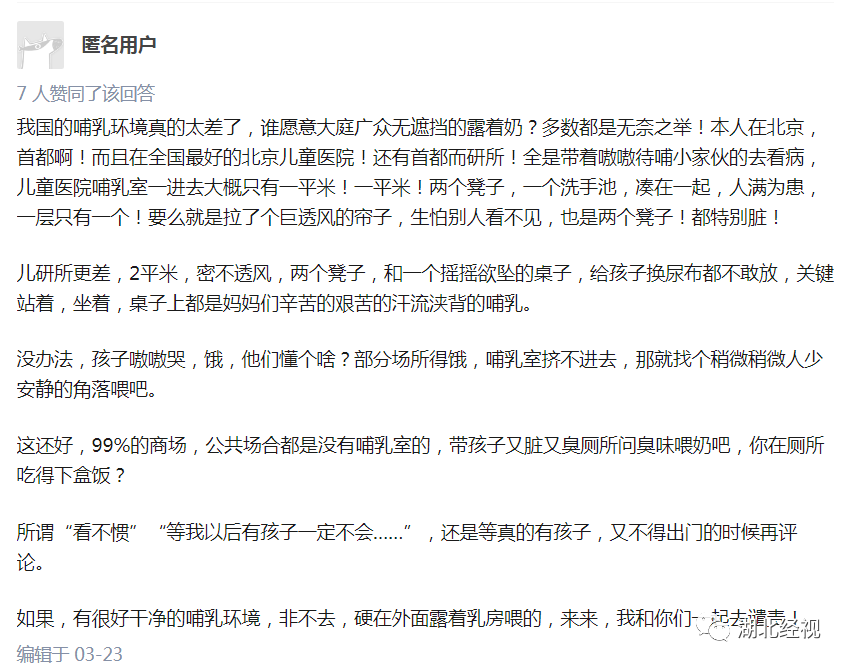 归根结底还是社会在母婴这一块的关注太少,现在设置母婴室的公共场合少之又少,或者是形同虚设。有时找不到合适的地方哺乳,孩子又嗷嗷待哺,妈妈们不得已只能在众目睽睽下给宝宝哺乳。