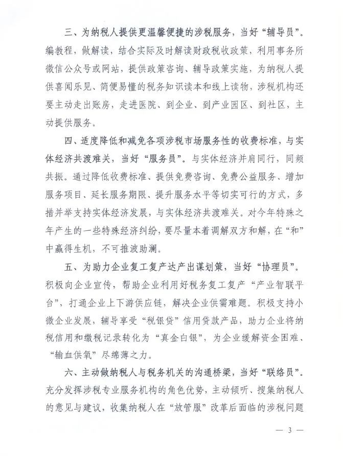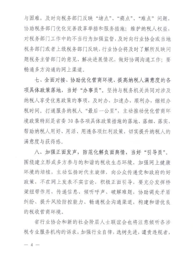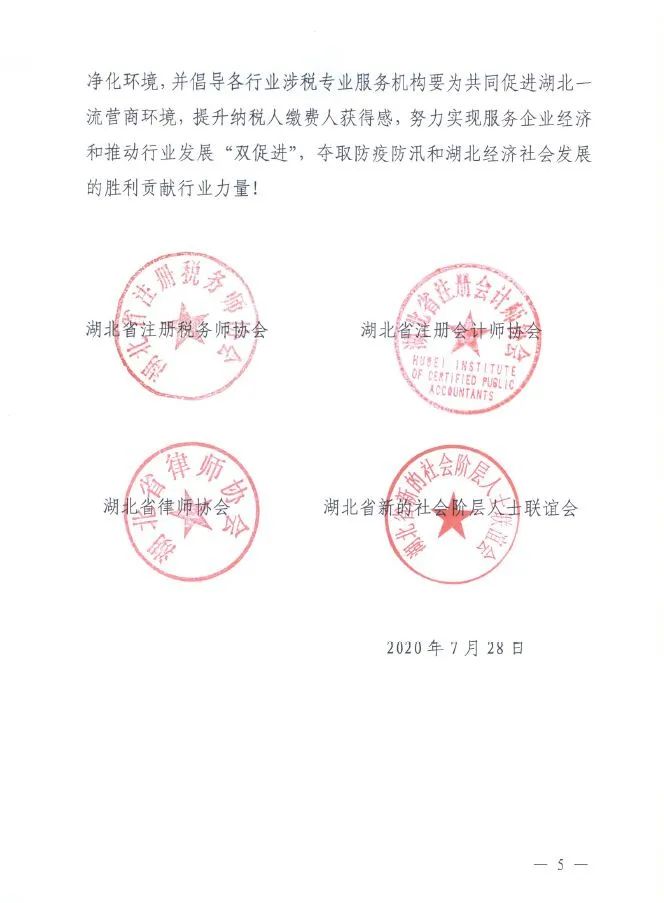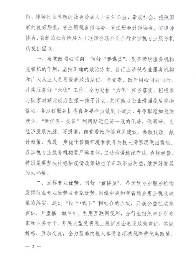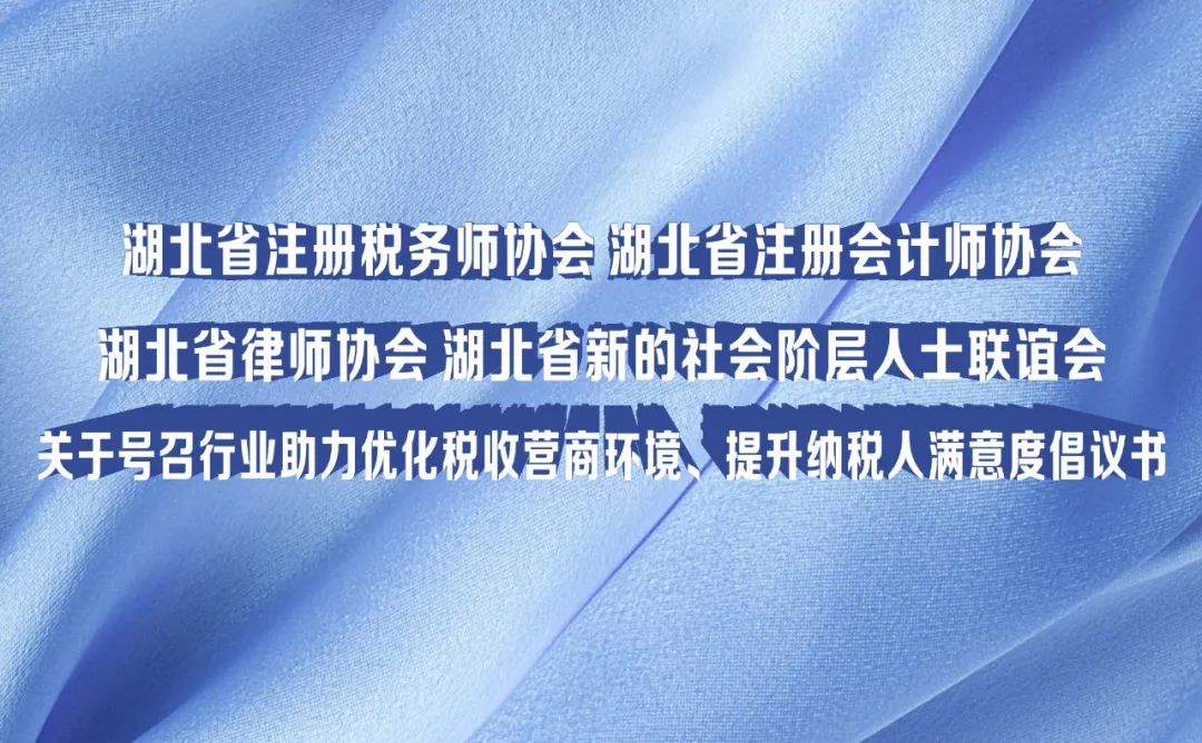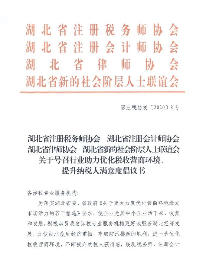 为积极引导涉税专业服务机构更好地服务于社会经济发展,加快湖北疫后经济重振,进一步优化湖北税收营商环境,不断提升纳税人获得感,省注册税务师协会、省注册会计师协会、省律师协会和省新的社会阶层人士联谊会共同发出倡议,号召全行业涉税专业服务机构与党和政府同心同向,发挥专业优势,携手为“优化税收营商环境 提升纳税人满意度”助力!
