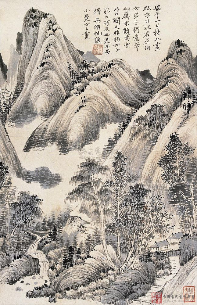 徐志摩去世后,陆小曼一改慵懒生活,拜贺天健为师学习山水。为督促陆小曼,这位老师还跟她约法三章:“杂事丢开,学要所成,中途不得辍学”,并且,还要求她对古今名家作品静观细看。这种教学之道在贺天健之前的题跋中也能看出:“东坡论画鄙形似,懒瓒云山写意多,摘得骊龙颔下物,何须粉本拓山阿”。