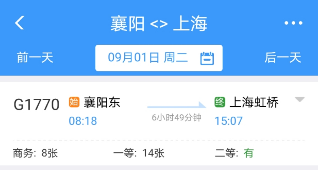 票价如下:襄阳东到上海虹桥高铁商务座票价为1439元,一等座票价为754元,二等座票价为464.5元,全程需要6小时49分钟。