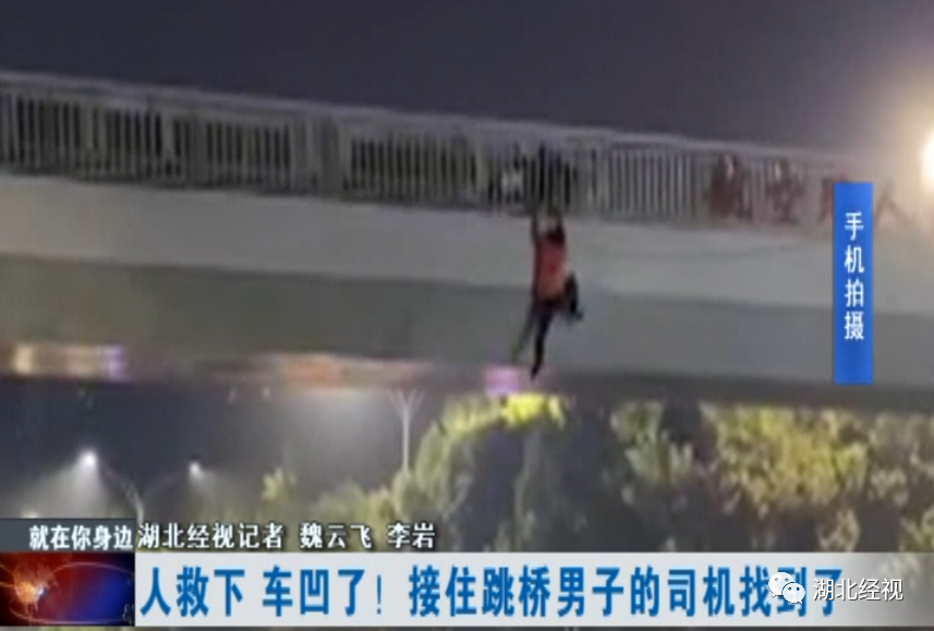 9月13日晚上,一男子悬挂在武汉市江汉区航空路人行天桥的外侧,随时可能掉入滚滚车流当中。就在这时,一辆面包车缓缓停在了男子的正下方,男子顺势掉落在车顶上,死里逃生。
