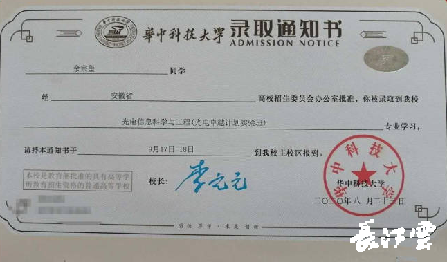 今年高考,余宗玺以668分如愿考取了华中科技大学。余宗玺表示因为母亲来武汉支援,它更想了解武汉,母亲曾经战斗过的地方。越了解越喜欢越向往,高考成绩出来以后毫无疑问的就选择了华科。