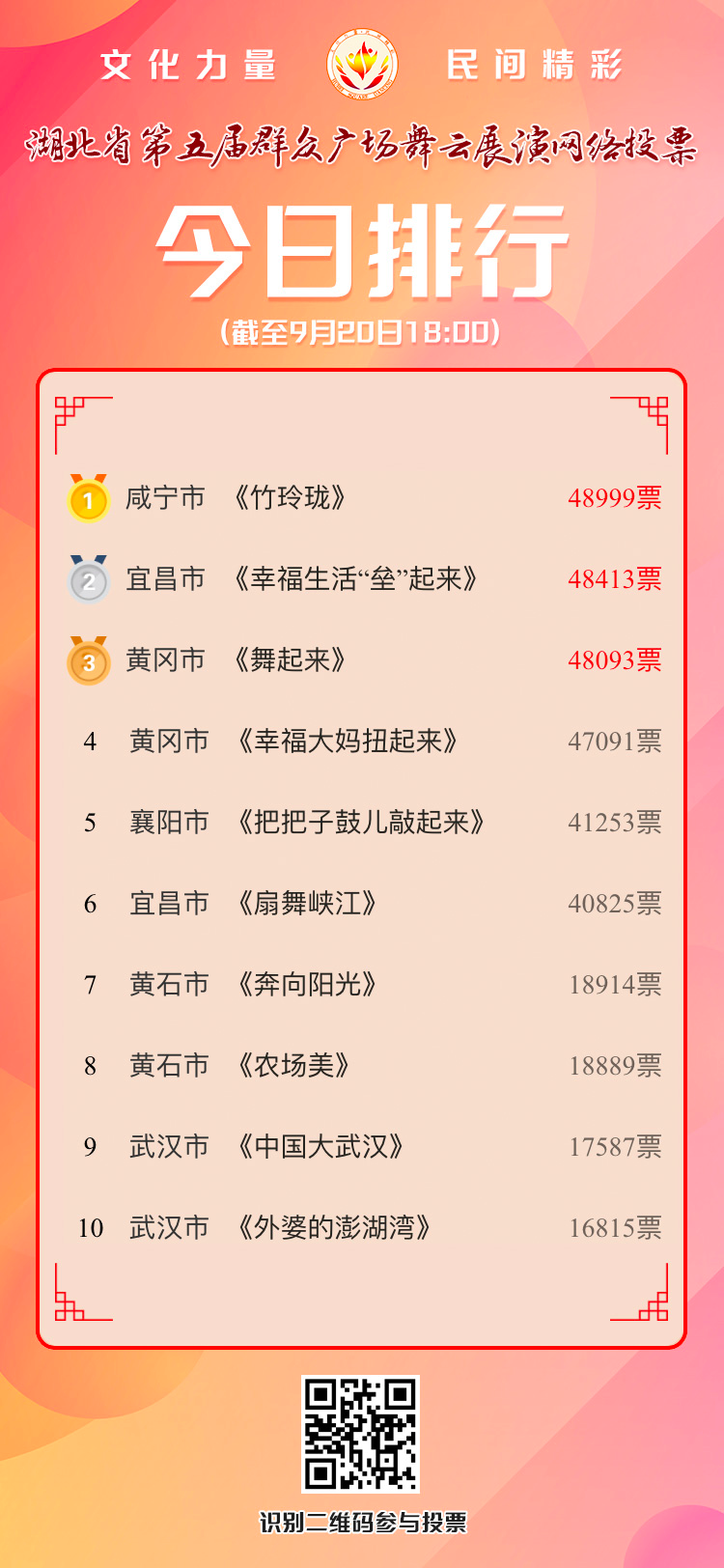 9月16日,“文化力量·民间精彩”全省第五届群众广场舞云展演网络投票通道正式开启。来自17个市(州)的34个广场舞作品参加评选。截止9月20日18:00,投票排行如下: