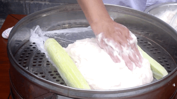 3、最后一步就是蒸鱼糕啦。将蒸笼铺上湿纱布,倒入鱼茸糊用刀抹平,盖上笼盖,用旺火沸水蒸40分钟,揭开笼盖,用干净纱布搌干鱼糕表面水气,将鸡蛋黄均匀地抹在鱼糕表面,盖上笼盖,冷后翻倒在案板上,用刀顺长改切成的鱼糕坯,即可加工各式鱼糕菜肴。