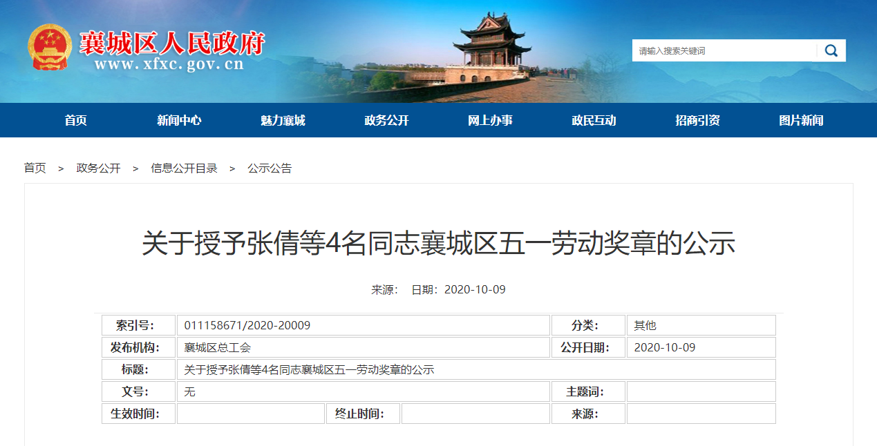 关于授予张倩等4名同志襄城区五一劳动奖章的公示