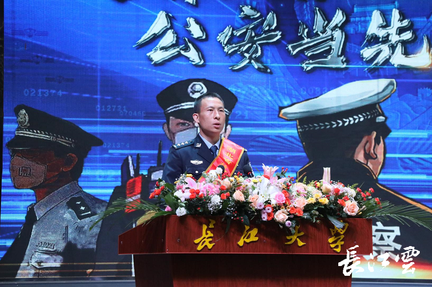 “选择无畏,只因头顶警徽。”武汉市公安局江岸分局新村街派出所副所长邵玉春上台讲述他的抗疫故事。疫情期间转送病患87人次,救助群众53人次,他背送疑似患者周爹爹就医的事迹被多家国家级、省级媒体报道。